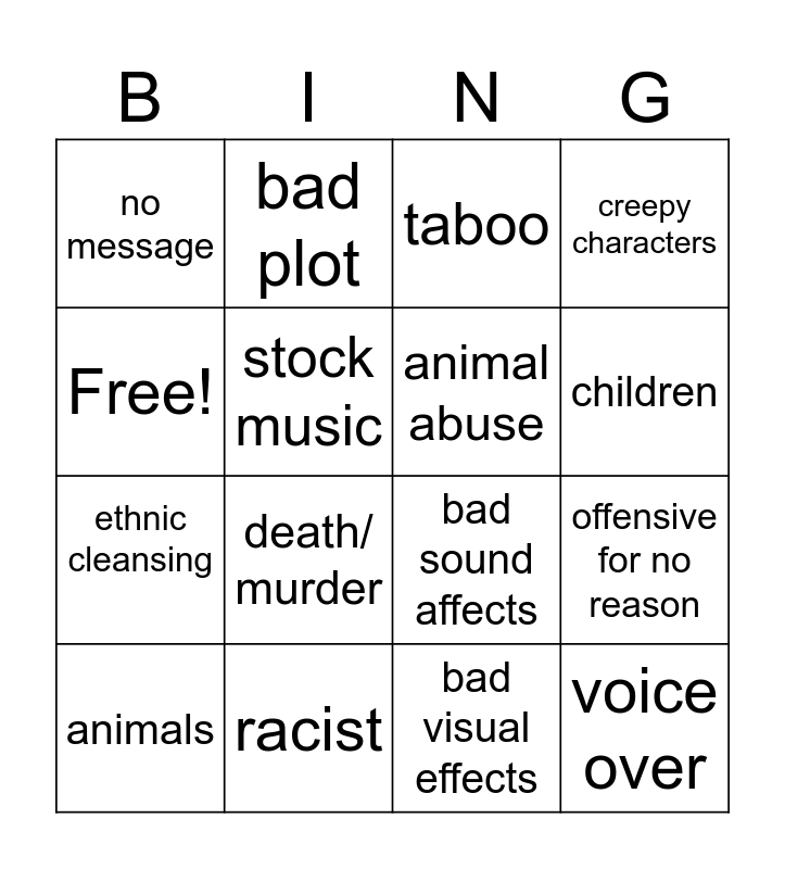 This bingo card has 16 words: racist, offensive for no reason, taboo, no message, ethnic cleansing, bad plot, bad sound affects, bad visual effects, Free!, stock music, animals, creepy characters, death/ murder, children, animal abuse and voice over.
