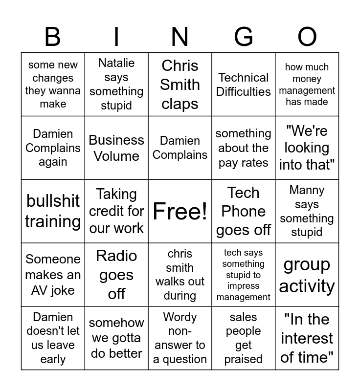 This bingo card has a free space and 26 words: chris smith walks out during, sales people get praised, Damien Complains, somehow we gotta do better, how much money management has made, some new changes they wanna make, Damien Complains again, Natalie says something stupid, Manny says something stupid, tech says something stupid to impress management, something about the pay rates, bullshit training, group activity, Damien doesn't let us leave early, Taking credit for our work, Comment about the food, Technical Difficulties, Someone makes an AV joke, Chris Smith claps, "In the interest of time", "We're looking into that", Wordy non-answer to a question, Tech Phone goes off, Radio goes off, Business Volume and Center Stage Points.