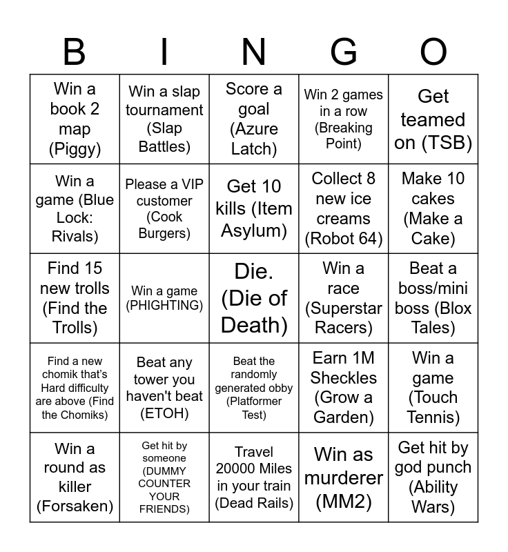 This bingo card has a free space and 24 words: Win a round as killer (Forsaken), Beat any tower you haven't beat (ETOH), Get 10 kills (Item Asylum), Win as murderer (MM2), Get teamed on (TSB), Win a book 2 map (Piggy), Win a slap tournament (Slap Battles), Score a goal (Azure Latch), Win a race (Superstar Racers), Beat a boss/mini boss (Blox Tales), Find 15 new trolls (Find the Trolls), Please a VIP customer (Cook Burgers), Earn 1M Sheckles (Grow a Garden), Win a game (Touch Tennis), Win a game (Blue Lock: Rivals), Get hit by someone (DUMMY COUNTER YOUR FRIENDS), Travel 20000 Miles in your train (Dead Rails), Win 2 games in a row (Breaking Point), Make 10 cakes (Make a Cake), Find a new chomik that’s Hard difficulty are above (Find the Chomiks), Win a game (PHIGHTING), Beat the randomly generated obby (Platformer Test), Collect 8 new ice creams (Robot 64) and Get hit by god punch (Ability Wars).