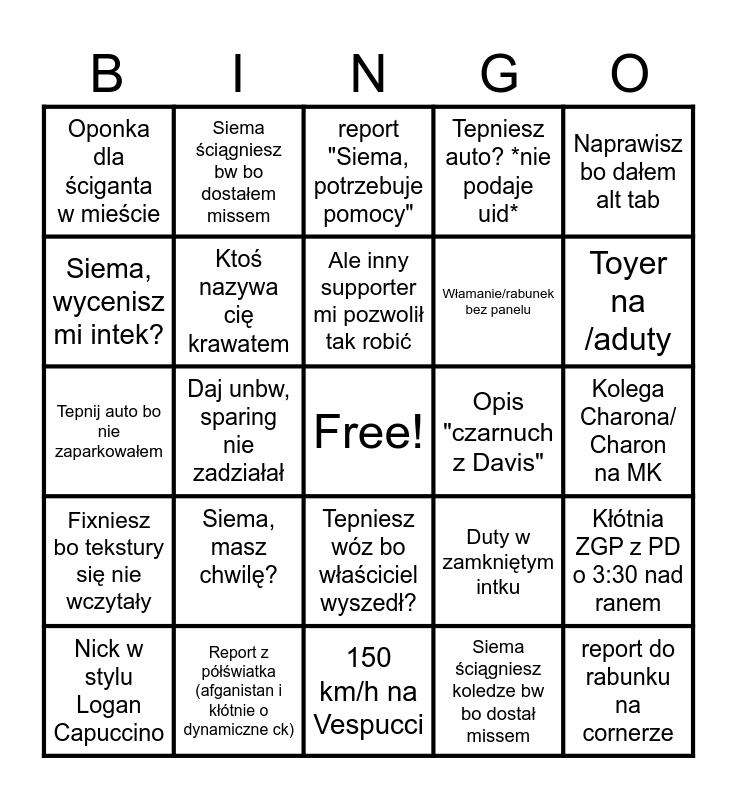 This bingo card has a free space and 24 words: Siema, masz chwilę?, Report z półświatka (afganistan i kłótnie o dynamiczne ck), Ale inny supporter mi pozwolił tak robić, Nick w stylu Logan Capuccino, Naprawisz bo dałem alt tab, Oponka dla ściganta w mieście, Siema, wycenisz mi intek?, Siema ściągniesz bw bo dostałem missem, Opis "czarnuch z Davis", Tepniesz wóz bo właściciel wyszedł?, Włamanie/rabunek bez panelu, Tepnij auto bo nie zaparkowałem, Duty w zamkniętym intku, Kłótnia ZGP z PD o 3:30 nad ranem, Ktoś nazywa cię krawatem, Siema ściągniesz koledze bw bo dostał missem, Kolega Charona/ Charon na MK, report "Siema, potrzebuje pomocy", Toyer na /aduty, Daj unbw, sparing nie zadziałał, report do rabunku na cornerze, Fixniesz bo tekstury się nie wczytały, Tepniesz auto? *nie podaje uid* and 150 km/h na Vespucci.