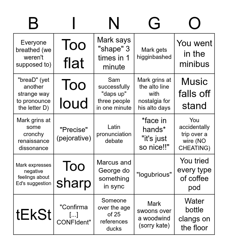 This bingo card has 25 words: Mark expresses negative feelings about Ed's suggestion, "Confirma [...] CONFIdent", Latin pronunciation debate, Mark swoons over a woodwind (sorry kate), You went in the minibus, Everyone breathed (we weren't supposed to), Too flat, Mark says "shape" 3 times in 1 minute, *face in hands* "it's just so nice!!", You tried every type of coffee pod, "breaD" (yet another strange way to pronounce the letter D), Too loud, Someone over the age of 25 references ducks, "logubrious", Music falls off stand, tEkSt, "Precise" (pejorative), Sam successfully "daps up" three people in one minute, Mark grins at the alto line with nostalgia for his alto days, You accidentally trip over a wire (NO CHEATING), Mark grins at some cronchy renaissance dissonance, Too sharp, Marcus and George do something in sync, Mark gets higginbashed and Water bottle clangs on the floor.