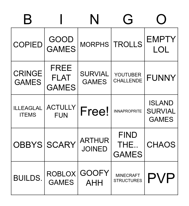 This bingo card has a free space and 24 words: SCARY, ROBLOX GAMES, SURVIAL GAMES, BUILDS., EMPTY LOL, COPIED, CRINGE GAMES, GOOD GAMES, INNAPROPRITE, ARTHUR JOINED, YOUTUBER CHALLENDE, ILLEAGLAL ITEMS, FIND THE.. GAMES, CHAOS, FREE FLAT GAMES, MINECRAFT STRUCTURES, ISLAND SURVIAL GAMES, MORPHS, FUNNY, ACTULLY FUN, PVP, OBBYS, TROLLS and GOOFY AHH.