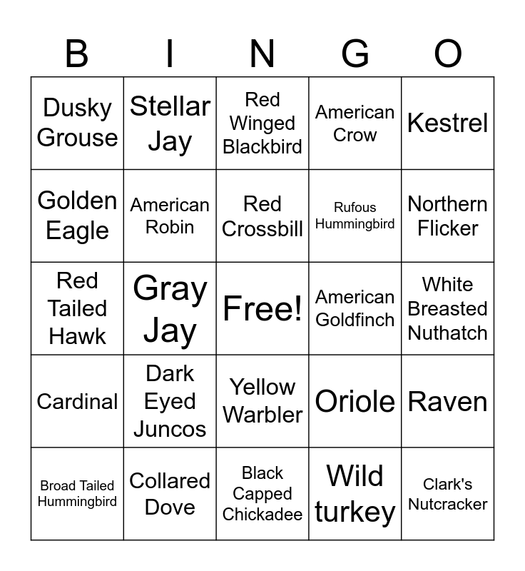 This bingo card has a free space and 28 words: Raven, Magpie, Rufous Hummingbird, Wild turkey, Golden Eagle, Red Winged Blackbird, Stellar Jay, Cardinal, American Goldfinch, Broad Tailed Hummingbird, Red Tailed Hawk, American Crow, Collared Dove, Black Capped Chickadee, Northern Flicker, Downy Woodpecker, Dark Eyed Juncos, American Robin, Red Crossbill, Yellow Warbler, Dusky Grouse, Mountain Bluebird, Clark's Nutcracker, Gray Jay, White Breasted Nuthatch, Oriole, Kestrel and Cedar Waxwing.