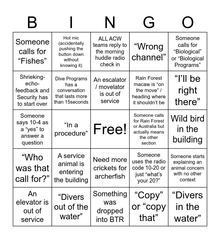This bingo card has a free space and 25 words: A service animal is entering the building, Something was dropped into BTR, An escalator / movelator is out of service, An elevator is out of service, Someone calls for “Biological” or “Biological Programs”, Someone calls for “Fishes”, Shrieking-echo-feedback and Security has to start over, Hot mic (accidentally pushing the button down without knowing it), Someone calls for Rain Forest or Australia but actually means the other section, Need more crickets for archerfish, Rain Forest macaw is “on the move” / heading where it shouldn’t be, Someone says 10-4 as a “yes” to answer a question, Someone uses the radio code 10-20 or just “what’s your 20?”, Someone starts explaining an animal concern with no other context, Dive Programs has a conversation that lasts more than 15seconds, Someone at ACRC asks if they can do a backwash, Wild bird in the building, ALL ACW teams reply to the morning huddle radio check in, “I’ll be right there”, “In a procedure”, “Divers in the water”, “Divers out of the water”, “Who was that call for?”, “Wrong channel” and “Copy” or “copy that”.