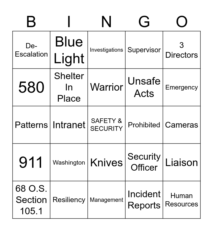 This bingo card has a free space and 24 words: Washington, Resiliency, Warrior, 68 O.S. Section 105.1, 3 Directors, De-Escalation, 580, Blue Light, Prohibited, Knives, Unsafe Acts, Patterns, Security Officer, Liaison, Shelter In Place, Incident Reports, Cameras, Investigations, Emergency, Intranet, Human Resources, 911, Supervisor and Management.
