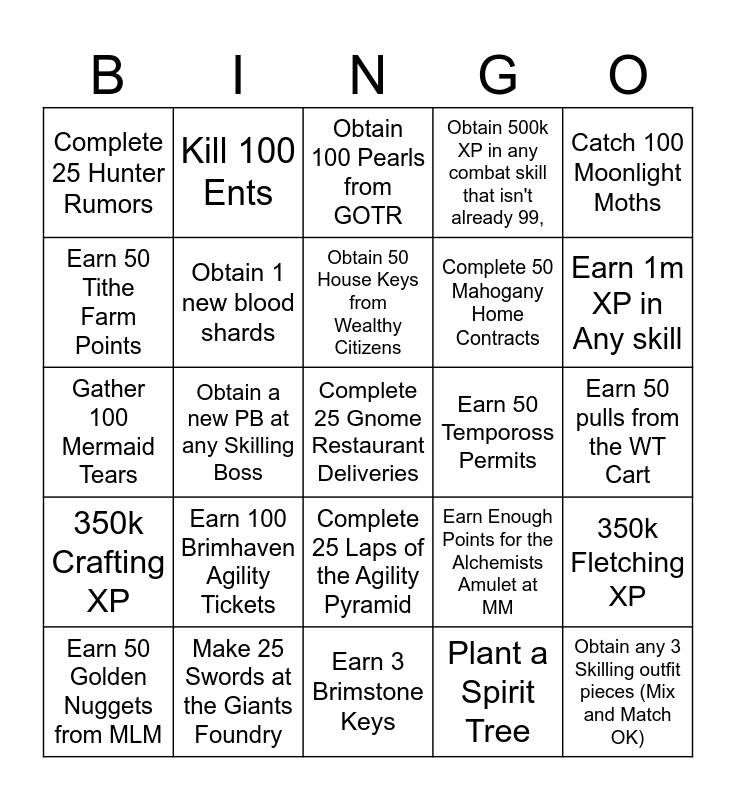 This bingo card has 25 words: Earn 100 Brimhaven Agility Tickets, Earn 3 Brimstone Keys, Obtain 50 House Keys from Wealthy Citizens, Earn 50 Golden Nuggets from MLM, Catch 100 Moonlight Moths, Complete 25 Hunter Rumors, Earn 50 Tithe Farm Points, Kill 100 Ents, Earn 50 Tempoross Permits, Complete 25 Laps of the Agility Pyramid, Complete 50 Mahogany Home Contracts, Gather 100 Mermaid Tears, Earn Enough Points for the Alchemists Amulet at MM, 350k Fletching XP, Obtain 1 new blood shards, Obtain any 3 Skilling outfit pieces (Mix and Match OK), Earn 50 pulls from the WT Cart, Obtain 100 Pearls from GOTR, Earn 1m XP in Any skill, Obtain a new PB at any Skilling Boss, Complete 25 Gnome Restaurant Deliveries, Make 25 Swords at the Giants Foundry, 350k Crafting XP, Obtain 500k XP in any combat skill that isn't already 99, and Plant a Spirit Tree.