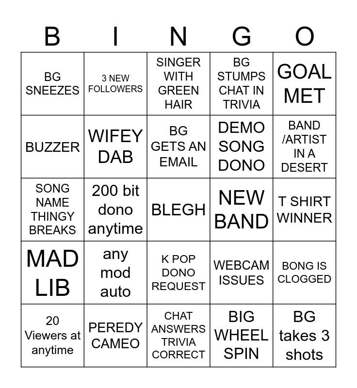 This bingo card has a free space and 24 words: any mod auto, PEREDY CAMEO, BG GETS AN EMAIL, 20 Viewers at anytime, GOAL MET, BG SNEEZES, BUZZER, 3 NEW FOLLOWERS, NEW BAND, K POP DONO REQUEST, DEMO SONG DONO, SONG NAME THINGY BREAKS, WEBCAM ISSUES, BONG IS CLOGGED, WIFEY DAB, BIG WHEEL SPIN, T SHIRT WINNER, SINGER WITH GREEN HAIR, BAND /ARTIST IN A DESERT, 200 bit dono anytime, BG takes 3 shots, MAD LIB, BG STUMPS CHAT IN TRIVIA and CHAT ANSWERS TRIVIA CORRECT.
