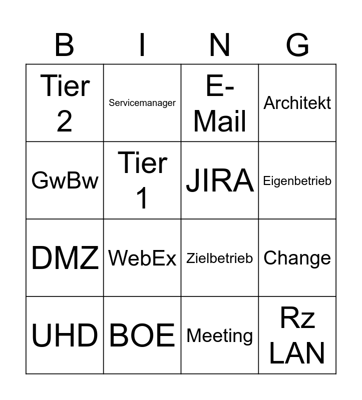 This bingo card has 16 words: BOE, Change, E-Mail, Tier 2, DMZ, Servicemanager, Zielbetrieb, Meeting, GwBw, Tier 1, UHD, Architekt, WebEx, Eigenbetrieb, JIRA and Rz LAN.