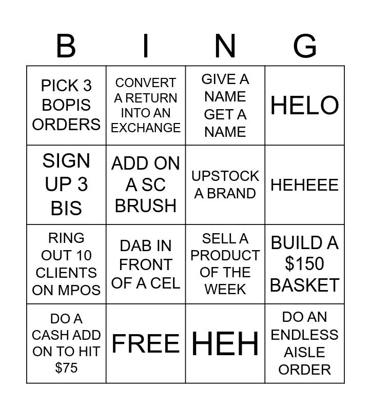 This bingo card has 20 words: BUILD A $150 BASKET, GET 25 MCIQ SCANS, GIVE A NAME GET A NAME, SEPHORA COLLECTION MULTIWORLD, DO A CASH ADD ON TO HIT $75, SIGN UP 3 BIS, FREE, PICK 3 BOPIS ORDERS, RING OUT 10 CLIENTS ON MPOS, CONVERT A RETURN INTO AN EXCHANGE, DAB IN FRONT OF A CEL, SELL A PRODUCT OF THE WEEK, ADD ON A SC BRUSH, DO AN ENDLESS AISLE ORDER, UPSTOCK A BRAND, FILL HYGIENE, HEHEEE, HELO, HEH and HEHE.