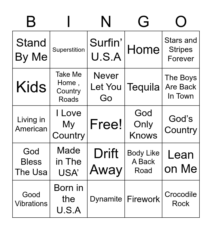 This bingo card has a free space and 61 words: Bad Moon Rising, Born in the U.S.A, American Girl, God Bless The Usa, Firework, Chicken Fried, Take Me Home , Country Roads, Carry on Wayward Son, Tequila, Rich Girl, Home, Mr.Brightside, Kids, Summer Of ‘69, Miami, Stand By Me, Crocodile Rock, Stars and Stripes Forever, Escape ( The Pina Colada Song ), Never Let You Go, God Only Knows, Surfin’ U.S.A, Good Vibrations, Lean on Me, Cheeseburger in Paradise, Margaritaville, Only Wanna Be With you, Hot, Hot, Hot, The Boys Are Back In Town, Old Time Rock & Roll, La Bamba, Uptight ( everything is alright ), American Woman, Beer Never Broke My Heart, Superstition, In The Summertime, The Longest Time, I Love My Country, 40 Hour Week ( For a Livin’), Living in American, Spirit of America, Made in The USA’, God’s Country, Chattahoochee, Body Like A Back Road, The Git Up, Celebration, Made in America, Cool for the Summer, Drift Away, Dynamite, Bang Bang, Summer Nights, Good Time, Nothin’ But a Good Time, Barbie Girl, All Summer Long, R.O.C.K. In The U.S.A., Glory Days, Life Is A Highway and I’m A Believer.