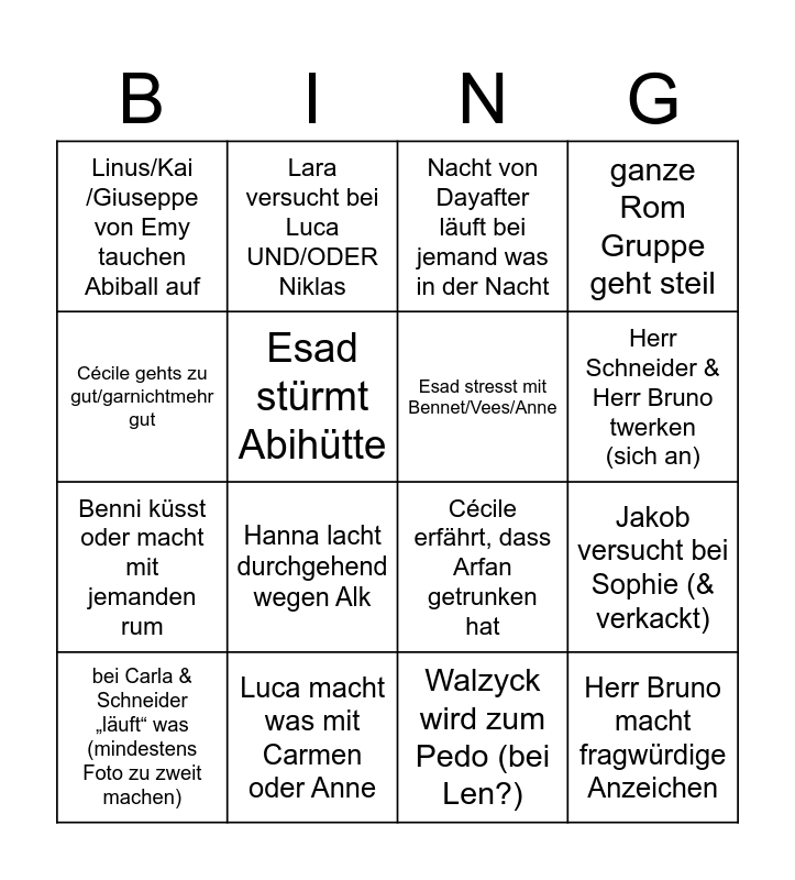 This bingo card has 16 words: Luca macht was mit Carmen oder Anne, Jakob versucht bei Sophie (& verkackt), Nacht von Dayafter läuft bei jemand was in der Nacht, Linus/Kai /Giuseppe von Emy tauchen Abiball auf, Benni küsst oder macht mit jemanden rum, Lara versucht bei Luca UND/ODER Niklas, Cécile erfährt, dass Arfan getrunken hat, Walzyck wird zum Pedo (bei Len?), Cécile gehts zu gut/garnichtmehr gut, Esad stürmt Abihütte, bei Carla & Schneider „läuft“ was (mindestens Foto zu zweit machen), ganze Rom Gruppe geht steil, Hanna lacht durchgehend wegen Alk, Herr Schneider & Herr Bruno twerken (sich an), Esad stresst mit Bennet/Vees/Anne and Herr Bruno macht fragwürdige Anzeichen.