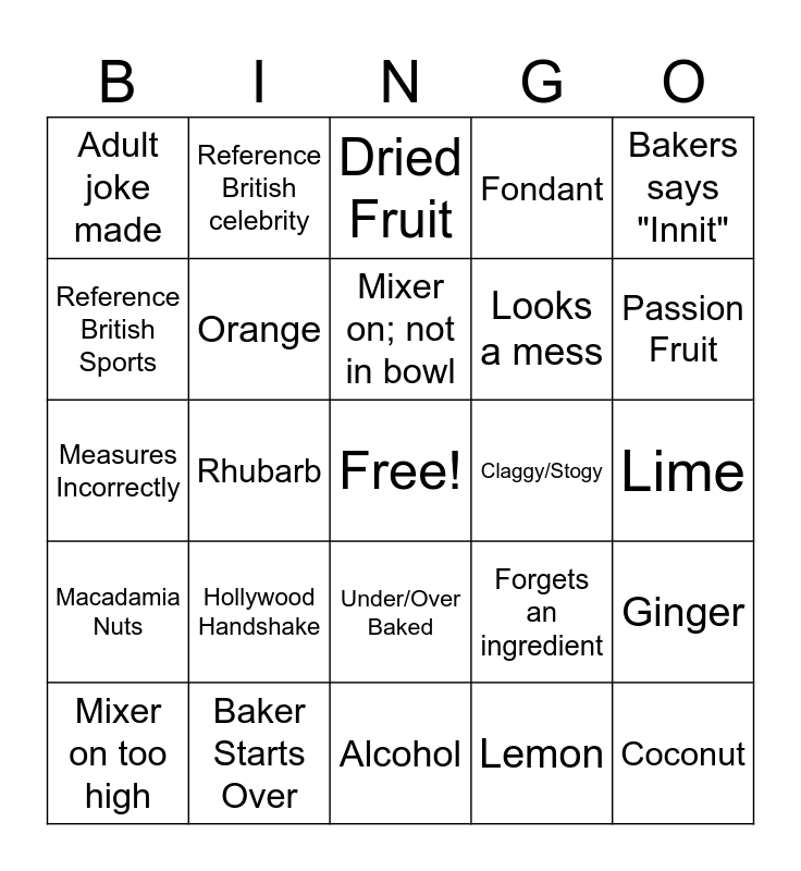 This bingo card has a free space and 24 words: Hollywood Handshake, Baker Starts Over, Mixer on; not in bowl, Mixer on too high, Bakers says "Innit", Adult joke made, Reference British Sports, Reference British celebrity, Claggy/Stogy, Under/Over Baked, Looks a mess, Measures Incorrectly, Forgets an ingredient, Ginger, Orange, Lemon, Lime, Dried Fruit, Passion Fruit, Rhubarb, Coconut, Macadamia Nuts, Fondant and Alcohol.