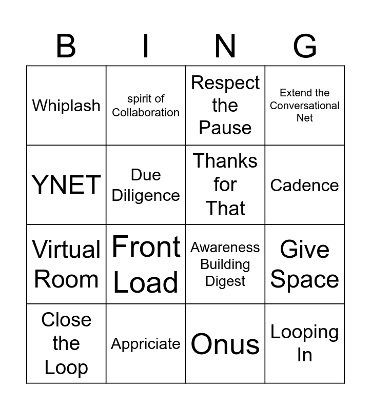 This bingo card has 16 words: Appriciate, Give Space, Respect the Pause, Whiplash, Virtual Room, spirit of Collaboration, Awareness Building Digest, Onus, YNET, Due Diligence, Close the Loop, Extend the Conversational Net, Front Load, Cadence, Thanks for That and Looping In.