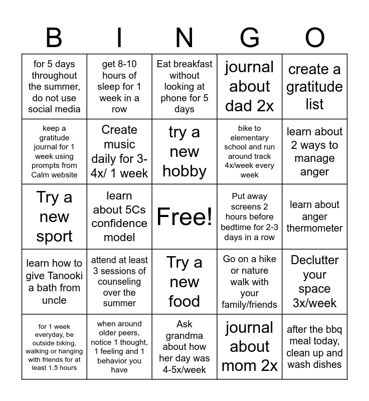 This bingo card has a free space and 24 words: attend at least 3 sessions of counseling over the summer, when around older peers, notice 1 thought, 1 feeling and 1 behavior you have, try a new hobby, for 1 week everyday, be outside biking, walking or hanging with friends for at least 1.5 hours, create a gratitude list, for 5 days throughout the summer, do not use social media, keep a gratitude journal for 1 week using prompts from Calm website, get 8-10 hours of sleep for 1 week in a row, Put away screens 2 hours before bedtime for 2-3 days in a row, Try a new food, bike to elementary school and run around track 4x/week every week, Try a new sport, Go on a hike or nature walk with your family/friends, Declutter your space 3x/week, Create music daily for 3-4x/ 1 week, journal about mom 2x, learn about anger thermometer, Eat breakfast without looking at phone for 5 days, learn about 2 ways to manage anger, learn about 5Cs confidence model, after the bbq meal today, clean up and wash dishes, learn how to give Tanooki a bath from uncle, journal about dad 2x and Ask grandma about how her day was 4-5x/week.