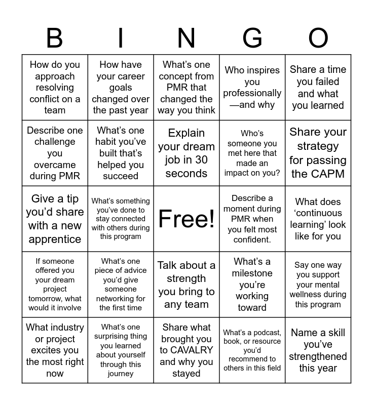 This bingo card has a free space and 24 words: What’s one piece of advice you’d give someone networking for the first time, What’s one surprising thing you learned about yourself through this journey, Explain your dream job in 30 seconds, What industry or project excites you the most right now, Share a time you failed and what you learned, How do you approach resolving conflict on a team, Describe one challenge you overcame during PMR, How have your career goals changed over the past year, Describe a moment during PMR when you felt most confident., Talk about a strength you bring to any team, Who’s someone you met here that made an impact on you?, Give a tip you’d share with a new apprentice, What’s a milestone you’re working toward, Say one way you support your mental wellness during this program, What’s one habit you’ve built that’s helped you succeed, What’s a podcast, book, or resource you’d recommend to others in this field, What does ‘continuous learning’ look like for you, What’s one concept from PMR that changed the way you think, Share your strategy for passing the CAPM, What’s something you’ve done to stay connected with others during this program, Name a skill you’ve strengthened this year, If someone offered you your dream project tomorrow, what would it involve, Who inspires you professionally —and why and Share what brought you to CAVALRY and why you stayed.