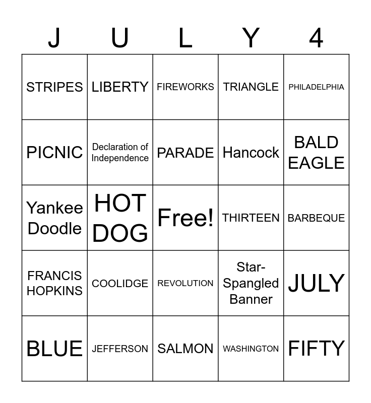 This bingo card has a free space and 24 words: COOLIDGE, JEFFERSON, PARADE, BLUE, PHILADELPHIA, STRIPES, PICNIC, LIBERTY, THIRTEEN, REVOLUTION, Hancock, Yankee Doodle, Star- Spangled Banner, JULY, Declaration of Independence, WASHINGTON, BARBEQUE, FIREWORKS, BALD EAGLE, HOT DOG, FIFTY, FRANCIS HOPKINS, TRIANGLE and SALMON.