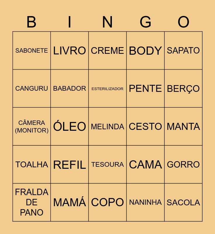 This bingo card has a free space and 70 words: BICO, MANTA, FRALDA, LENÇO, MAMÁ, CHUPETA, BODY, MEIA, SAPATO, LUVA, GORRO, ESCOVA, SABONETE, CREME, SHAMPOO, ÓLEO, TESOURA, PENTE, BANHEIRA, TOALHA, CESTO, CAMA, BERÇO, CÔMODA, ARMÁRIO, MÓBILE, TAPETE, ALMOFADA, NANINHA, PELÚCIA, LIVRO, BLOCOS, CHOCALHO, MORDEDOR, BRINQUEDO, CARRINHO, BEBÊ CONFORTO, CADEIRA, ANDADOR, CANGURU, TROCADOR, REFIL, SACOLA, BOLSA, ROUPA, BABADOR, FRALDA DE PANO, PROTETOR, TERMÔMETRO, ASPIRADOR, KIT HIGIENE, POTE, COLHER, PRATO, COPO, GARRAFA, ESTERILIZADOR, EXTRATOR, PORTA-LEITE, LIXEIRA, CÂMERA (MONITOR), TRAVESSEIRO, CUEIRO, COBERTOR, PERFUME, POMADA, ALGODÃO, GAZE, SORO and TERMÔMETRO DE BANHO.