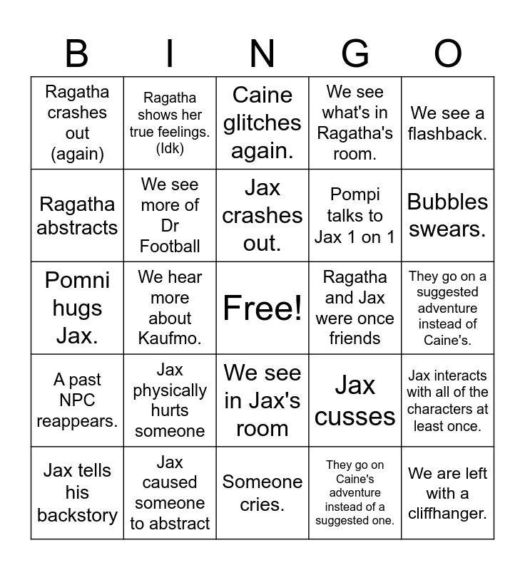 This bingo card has a free space and 24 words: Jax physically hurts someone, Jax caused someone to abstract, Jax crashes out., Jax tells his backstory, We see a flashback., Ragatha crashes out (again), Ragatha abstracts, Ragatha shows her true feelings. (Idk), Ragatha and Jax were once friends, We see in Jax's room, Pompi talks to Jax 1 on 1, Pomni hugs Jax., Jax cusses, Jax interacts with all of the characters at least once., We see more of Dr Football, They go on Caine's adventure instead of a suggested one., They go on a suggested adventure instead of Caine's., Caine glitches again., Bubbles swears., We hear more about Kaufmo., We are left with a cliffhanger., A past NPC reappears., We see what's in Ragatha's room. and Someone cries..