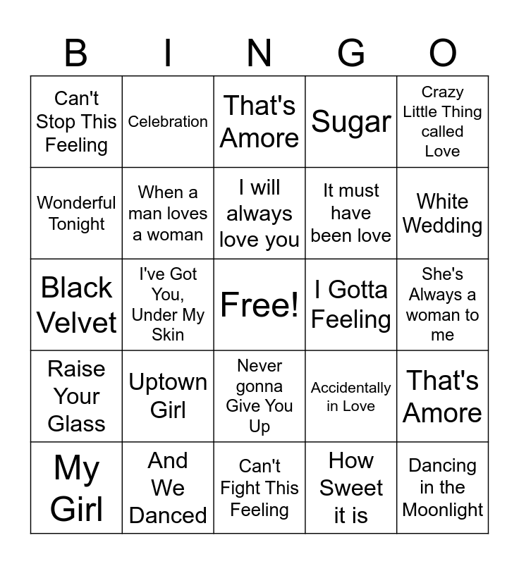 This bingo card has a free space and 44 words: This will be, Dancing in the Moonlight, Signed, Sealed, Delivered, My Girl, Better Together, How Sweet it is, That's Amore, You're the one that I want, Crazy Little Thing called Love, And We Danced, Sugar, I Gotta Feeling, Never gonna Give You Up, Uptown Girl, walking on a Dream, Can't Fight This Feeling, Head over Heels, Black Velvet, Hold Me Now, White Wedding, Celebration, Never Tear Us Apart, What Makes You Beautiful, Can't Stop This Feeling, Love Story, She's Always a woman to me, Better Together, The Way You Make Me Feel, Accidentally in Love, Raise Your Glass, Heaven Is A Place On Earth, That's Amore, Fly Me To The Moon, The Way you Look Tonight, I've Got You, Under My Skin, Unchained Melody, I want to know what love is, Strangers in the Night, I will always love you, Wonderful Tonight, It must have been love, You are so Beautiful, When a man loves a woman and How Sweet It Is.