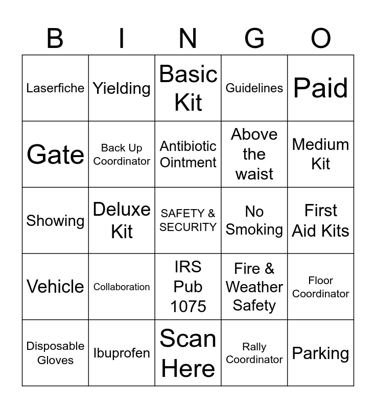 This bingo card has a free space and 24 words: Collaboration, Ibuprofen, Antibiotic Ointment, Disposable Gloves, Paid, Laserfiche, Gate, Yielding, No Smoking, IRS Pub 1075, Above the waist, Showing, Fire & Weather Safety, Floor Coordinator, Back Up Coordinator, Rally Coordinator, First Aid Kits, Basic Kit, Medium Kit, Deluxe Kit, Parking, Vehicle, Guidelines and Scan Here.
