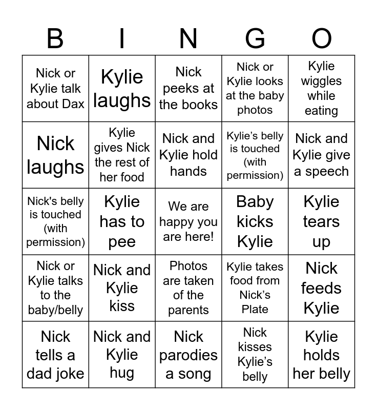 This bingo card has a free space and 24 words: Nick and Kylie kiss, Nick and Kylie hug, Nick and Kylie hold hands, Nick tells a dad joke, Kylie wiggles while eating, Nick or Kylie talk about Dax, Nick laughs, Kylie laughs, Baby kicks Kylie, Photos are taken of the parents, Kylie’s belly is touched (with permission), Nick's belly is touched (with permission), Kylie takes food from Nick’s Plate, Nick feeds Kylie, Kylie gives Nick the rest of her food, Nick kisses Kylie’s belly, Kylie tears up, Nick peeks at the books, Nick and Kylie give a speech, Kylie has to pee, Kylie holds her belly, Nick or Kylie talks to the baby/belly, Nick or Kylie looks at the baby photos and Nick parodies a song.