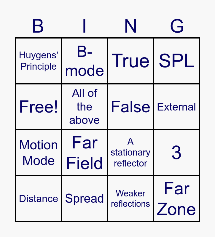 This bingo card has 16 words: Spread, 3, True, Huygens' Principle, Motion Mode, B-mode, A stationary reflector, Weaker reflections, Free!, All of the above, Distance, SPL, Far Field, External, False and Far Zone.
