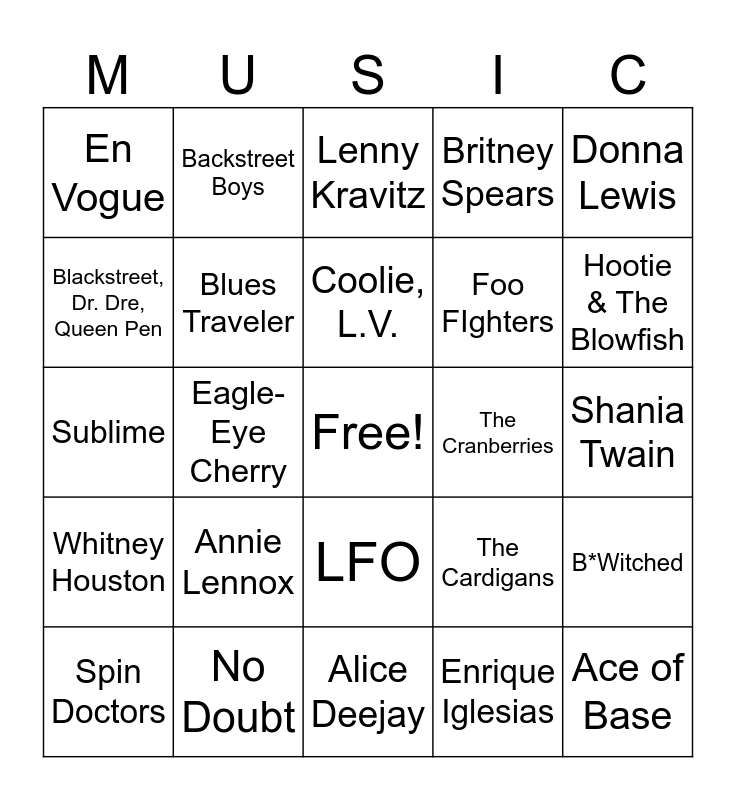 This bingo card has a free space and 50 words: 2pac, Roger, Dr. Dre, Ace of Base, Alanis Morisette, Alice Deejay, Annie Lennox, Aqua, Backstreet Boys, Barenaked Ladies, Blackstreet, Dr. Dre, Queen Pen, Blind Melon, Blues Traveler, Britney Spears, B*Witched, The Cardigans, Cher, Christina Aguilera, Coolie, L.V., The Cranberries, Destiny's Child, Donna Lewis, Eagle-Eye Cherry, Enrique Iglesias, En Vogue, Foo FIghters, Haddaway, Hanson, Hootie & The Blowfish, Jennifer Lopez, Lenny Kravitz, LFO, Lou Bega, Madonna, MC Hammer, Meredith Brooks, No Doubt, *NSYNC, Ricky Martin, Santana, Rob Thomas, Shaggy, Shania Twain, Sheryl Crow, Sir Mix-A-Lot, Smash Mouth, Spice Girls, Spin Doctors, Sublime, Suzanne Vega, Third Eye Blind, Whitney Houston and Wilson Phillips.
