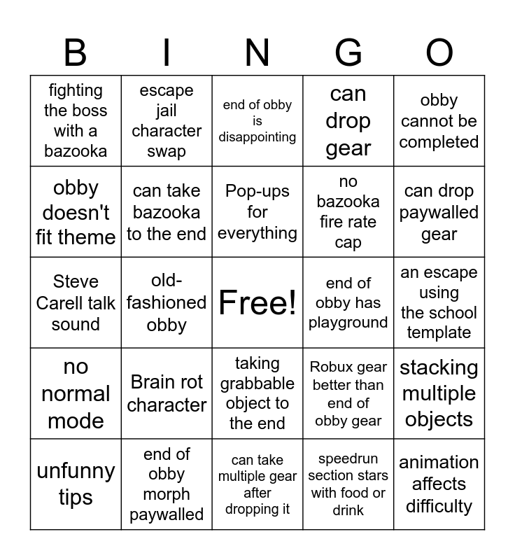 This bingo card has a free space and 24 words: Brain rot character, end of obby morph paywalled, Pop-ups for everything, unfunny tips, obby cannot be completed, fighting the boss with a bazooka, obby doesn't fit theme, escape jail character swap, end of obby has playground, taking grabbable object to the end, no bazooka fire rate cap, Steve Carell talk sound, Robux gear better than end of obby gear, stacking multiple objects, can take bazooka to the end, speedrun section stars with food or drink, an escape using the school template, end of obby is disappointing, can drop paywalled gear, old-fashioned obby, animation affects difficulty, no normal mode, can drop gear and can take multiple gear after dropping it.