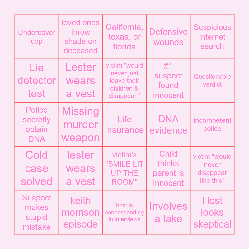 This bingo card has a free space and 24 words: lester wears a vest, keith morrison episode, victim "would never just leave their children & disappear ", Suspect makes stupid mistake, Suspicious internet search, Undercover cop, Lie detector test, loved ones throw shade on deceased, DNA evidence, victim's "SMILE LIT UP THE ROOM", #1 suspect found innocent, Police secretly obtain DNA, Child thinks parent is innocent, victim "would never disappear like this", Lester wears a vest, Involves a lake, Incompetent police, California, texas, or florida, Questionable verdict, Missing murder weapon, Host looks skeptical, Cold case solved, Defensive wounds and host is condescending in interviews.