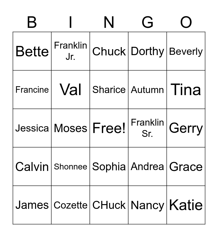 This bingo card has a free space and 24 words: Shonnee, Cozette, Sharice, James, Beverly, Bette, Francine, Franklin Jr., Franklin Sr., Sophia, Autumn, Jessica, Andrea, Grace, Val, Nancy, Gerry, Chuck, Tina, Moses, Katie, Calvin, Dorthy and CHuck.