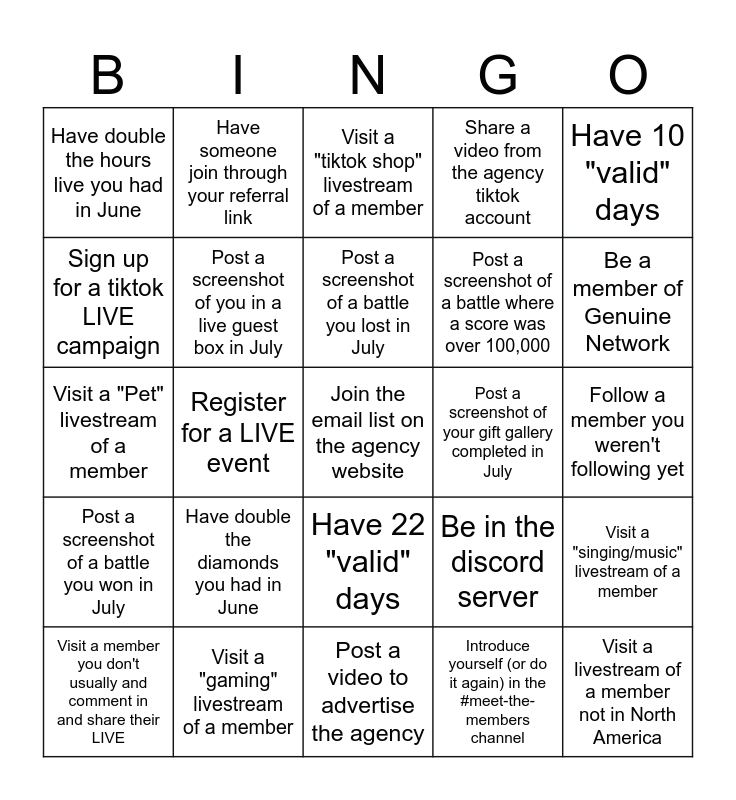 This bingo card has 25 words: Have double the diamonds you had in June, Post a video to advertise the agency, Post a screenshot of a battle you lost in July, Visit a member you don't usually and comment in and share their LIVE, Have 10 "valid" days, Have double the hours live you had in June, Sign up for a tiktok LIVE campaign, Have someone join through your referral link, Post a screenshot of your gift gallery completed in July, Have 22 "valid" days, Post a screenshot of a battle where a score was over 100,000, Visit a "Pet" livestream of a member, Be in the discord server, Visit a "singing/music" livestream of a member, Post a screenshot of you in a live guest box in July, Visit a livestream of a member not in North America, Follow a member you weren't following yet, Visit a "tiktok shop" livestream of a member, Be a member of Genuine Network, Register for a LIVE event, Join the email list on the agency website, Visit a "gaming" livestream of a member, Post a screenshot of a battle you won in July, Share a video from the agency tiktok account and Introduce yourself (or do it again) in the #meet-the-members channel.