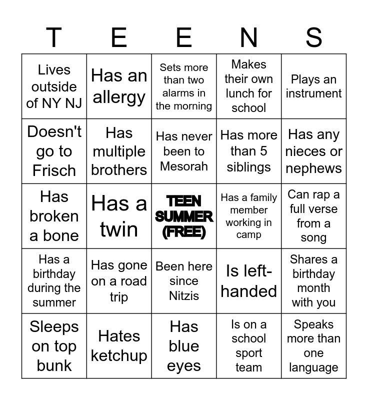 This bingo card has a free space and 35 words: Has a pet, From Teaneck, Has multiple sisters, Has multiple brothers, Been here since Nitzis, Makes their own lunch for school, Doesn't go to Frisch, Has been to Panama before, Has never been to Mesorah, Has a food allergy, Has broken a bone, Plays an instrument, Has a sibling in camp, It's their fourth summer in camp, Lives outside of NY NJ, Has a family member working in camp, Is on a school sport team, Has a twin, Has a birthday during the summer, Speaks more than one language, Is left-handed, Sleeps on top bunk, Shares a birthday month with you, Hates ketchup, Sets more than two alarms in the morning, Has any nieces or nephews, Is the oldest, Is the youngest, Has more than 5 siblings, Can rap a full verse from a song, Goes to an all girls/boys school, Has blue eyes, Has gone on a road trip, Has an allergy and Has been to more than 3 countries.