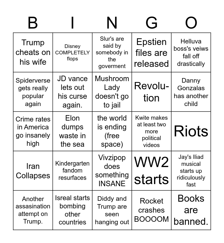 This bingo card has a free space and 24 words: Kindergarten fandom resurfaces, Isreal starts bombing other countries, Mushroom Lady doesn't go to jail, Another assasination attempt on Trump., Helluva boss's veiws fall off drastically, Trump cheats on his wife, Spiderverse gets really popular again, Disney COMPLETELY flops, Kwite makes at least two more political videos, Vivzipop does something INSANE, Revolu-tion, Crime rates in America go insanely high, WW2 starts, Jay's Iliad musical starts up ridiculously fast, JD vance lets out his curse again., Rocket crashes BOOOOM, Riots, Slur's are said by somebody in the goverment, Danny Gonzalas has another child, Elon dumps waste in the sea, Books are banned., Iran Collapses, Epstien files are released and Diddy and Trump are seen hanging out.