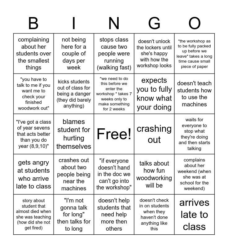 This bingo card has a free space and 24 words: crashes out about two people being near the machines, "I'm not gonna talk for long" then talks for to long, "we need to do this before we enter the workshop " takes 7 weeks only to make something for 2 weeks, story about student that almost died when she was teaching (how did she not get fired), "the workshop as to be fully packed up before we leave" takes a long time cause small piece of paper, complaining about her students over the smallest things, "you have to talk to me if you want me to check your finished woodwork out", not being here for a couple of days per week, crashing out, "if everyone doesn't hand in the doc we can't go into the workshop", expects you to fully know what your doing, "I've got a class of year sevens that acts better than you do year (8,9,10)", talks about how fun woodworking will be, complains about her weekend (when she was at school for the weekend), kicks students out of class for being a danger (they did barely anything), doesn't check in on students when they haven't done anything like this, waits for everyone to stop what they're doing and then starts talking, stops class cause two people were running (walking fast), doesn't teach students how to use the machines, blames student for hurting themselves, arrives late to class, gets angry at students who arrive late to class, doesn't unlock the lockers until she's happy with how the workshop looks and doesn't help students that need help more then others.