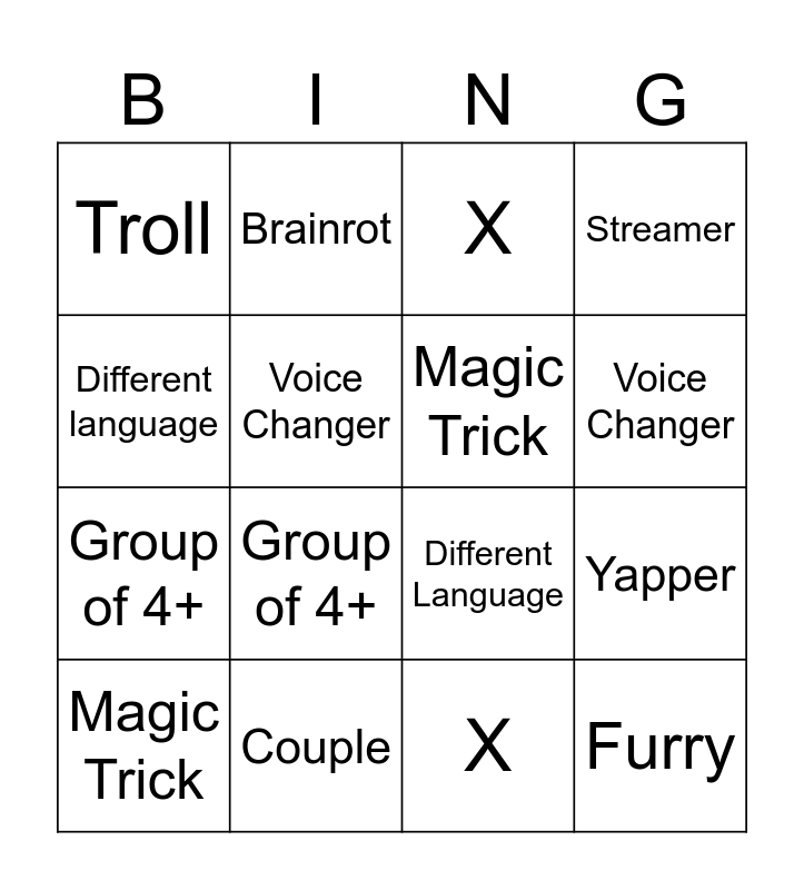 This bingo card has 22 words: Couple, Rich, Brainrot, Parent, Voice Changer, Magic Trick, Troll, X, Different Language, Furry, Group of 4+, Streamer, Musician, X, X, British, Yapper, Magic Trick, Group of 4+, Different language, Voice Changer and No mic.