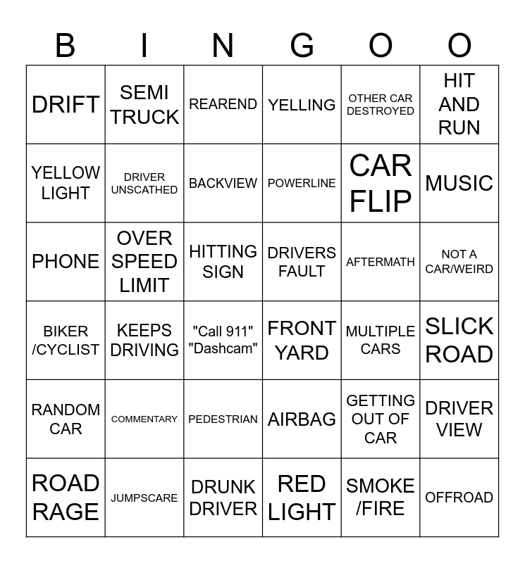 This bingo card has 36 words: AIRBAG, PEDESTRIAN, RED LIGHT, YELLOW LIGHT, BIKER /CYCLIST, DRIVERS FAULT, DRIVER UNSCATHED, DRUNK DRIVER, OTHER CAR DESTROYED, GETTING OUT OF CAR, MUSIC, YELLING, DRIVER VIEW, OVER SPEED LIMIT, POWERLINE, DRIFT, RANDOM CAR, AFTERMATH, PHONE, REAREND, HITTING SIGN, KEEPS DRIVING, FRONT YARD, "Call 911" "Dashcam", MULTIPLE CARS, SEMI TRUCK, CAR FLIP, JUMPSCARE, BACKVIEW, HIT AND RUN, OFFROAD, ROAD RAGE, SLICK ROAD, NOT A CAR/WEIRD, COMMENTARY and SMOKE /FIRE.