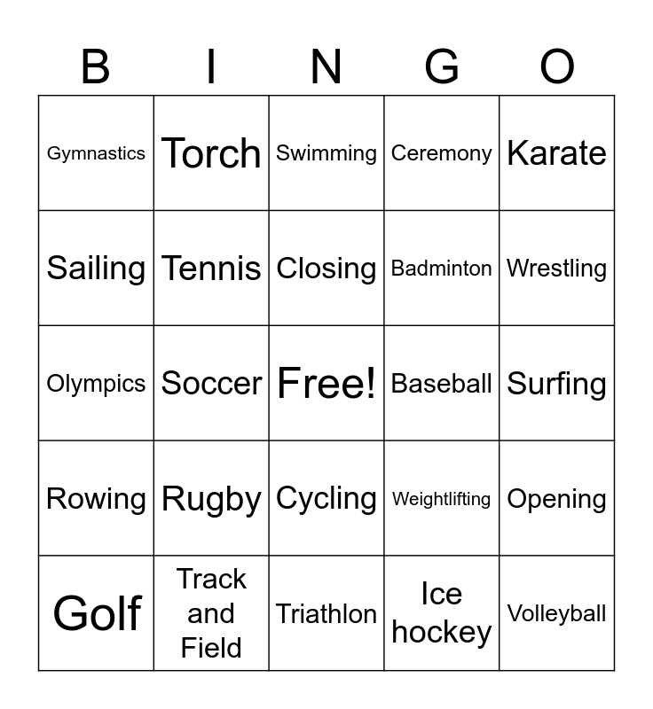 This bingo card has a free space and 29 words: Golf, Basketball, Soccer, Diving, Gymnastics, Swimming, Tennis, Rugby, Baseball, Track and Field, Surfing, Volleyball, Triathlon, Ice hockey, Wrestling, Water Polo, Cycling, Rowing, Karate, Olympics, Weightlifting, Beach Volleyball, Badminton, Sailing, Ceremony, Torch, Opening, Closing and Olympic Village.