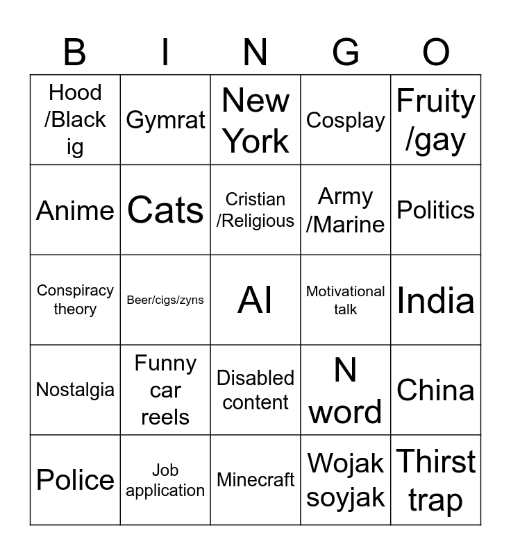 This bingo card has a free space and 24 words: Funny car reels, Job application, Cristian /Religious, Police, Fruity /gay, Hood /Black ig, Anime, Gymrat, Motivational talk, Disabled content, Army /Marine, Conspiracy theory, N word, China, Cats, Wojak soyjak, India, New York, Politics, Beer/cigs/zyns, Thirst trap, Nostalgia, Cosplay and Minecraft.