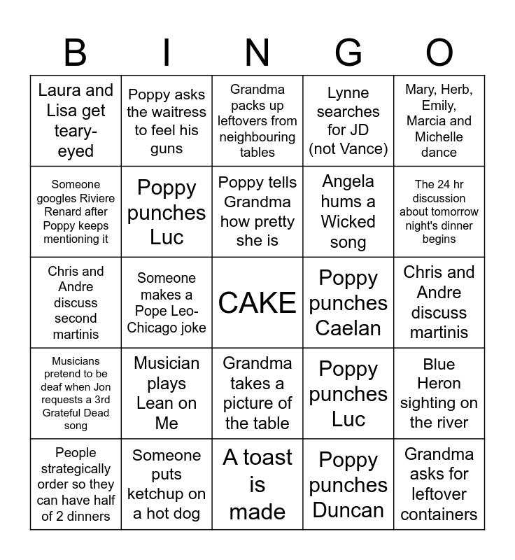 This bingo card has a free space and 24 words: Musician plays Lean on Me, Someone puts ketchup on a hot dog, Poppy tells Grandma how pretty she is, People strategically order so they can have half of 2 dinners, Mary, Herb, Emily, Marcia and Michelle dance, Laura and Lisa get teary-eyed, Someone googles Riviere Renard after Poppy keeps mentioning it, Poppy asks the waitress to feel his guns, Poppy punches Caelan, Grandma takes a picture of the table, Angela hums a Wicked song, Chris and Andre discuss second martinis, Poppy punches Luc, Blue Heron sighting on the river, Poppy punches Luc, Poppy punches Duncan, Chris and Andre discuss martinis, Grandma packs up leftovers from neighbouring tables, The 24 hr discussion about tomorrow night's dinner begins, Someone makes a Pope Leo-Chicago joke, Grandma asks for leftover containers, Musicians pretend to be deaf when Jon requests a 3rd Grateful Dead song, Lynne searches for JD (not Vance) and A toast is made.
