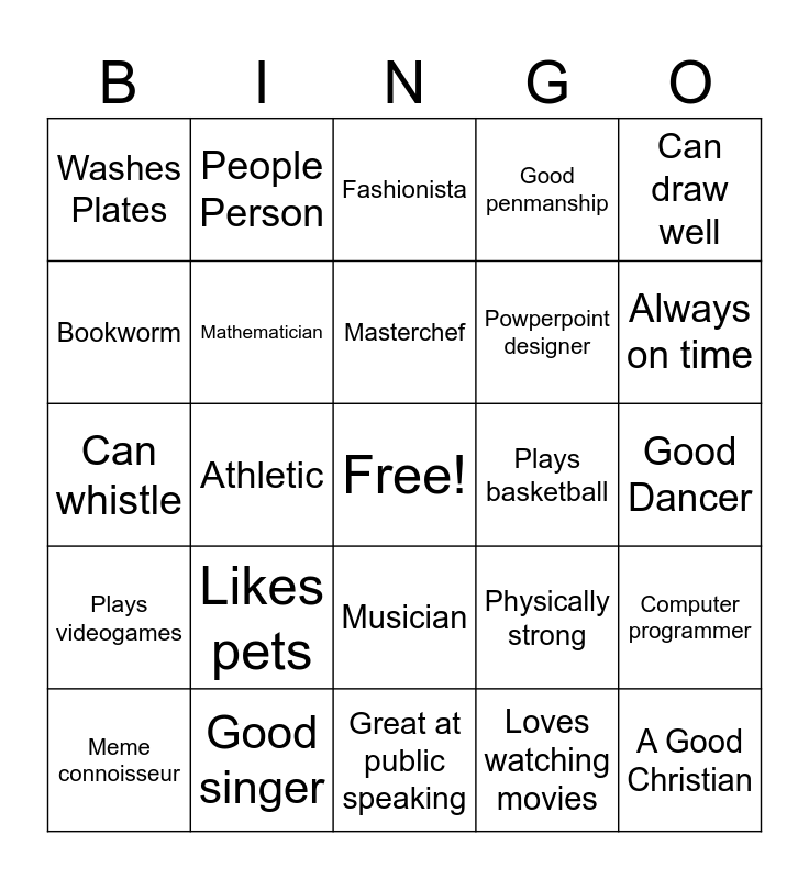 This bingo card has a free space and 24 words: Likes pets, Good singer, Masterchef, Meme connoisseur, Can draw well, Washes Plates, Bookworm, People Person, Plays basketball, Musician, Powperpoint designer, Can whistle, Physically strong, Computer programmer, Mathematician, Loves watching movies, Good Dancer, Fashionista, Always on time, Athletic, A Good Christian, Plays videogames, Good penmanship and Great at public speaking.
