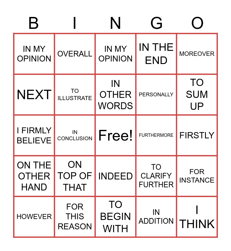 This bingo card has a free space and 24 words: ON TOP OF THAT, FOR THIS REASON, IN OTHER WORDS, HOWEVER, MOREOVER, IN MY OPINION, NEXT, OVERALL, FURTHERMORE, INDEED, PERSONALLY, I FIRMLY BELIEVE, TO CLARIFY FURTHER, FOR INSTANCE, TO ILLUSTRATE, IN ADDITION, FIRSTLY, IN MY OPINION, TO SUM UP, IN CONCLUSION, I THINK, ON THE OTHER HAND, IN THE END and TO BEGIN WITH.