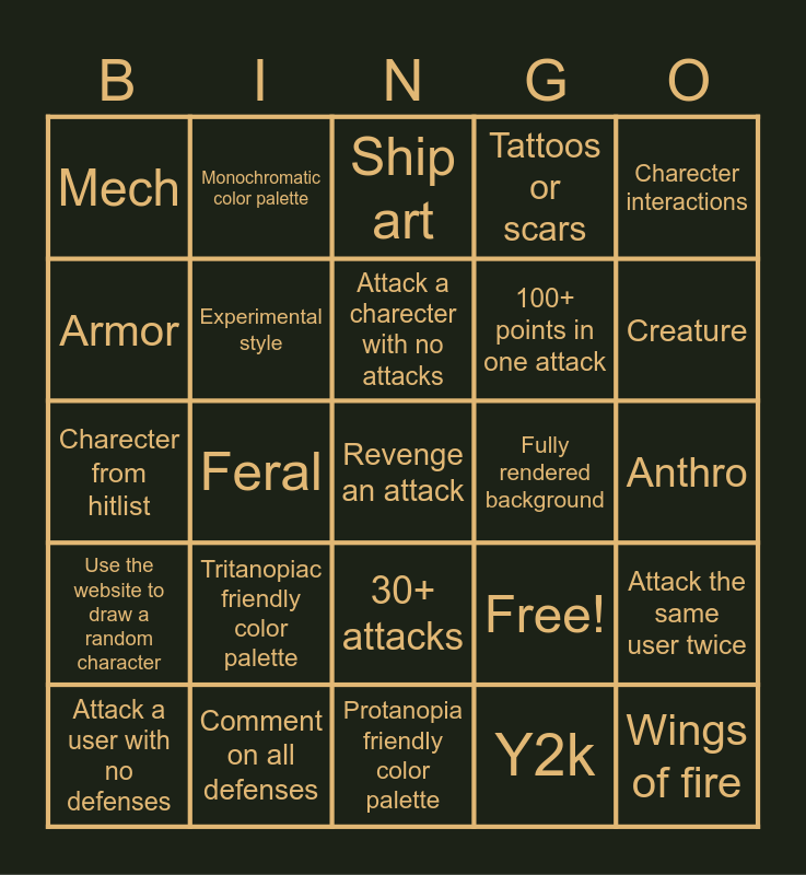 This bingo card has 25 words: Tritanopiac friendly color palette, Protanopia friendly color palette, Attack a charecter with no attacks, Attack a user with no defenses, Charecter interactions, Mech, Armor, Monochromatic color palette, Fully rendered background, 30+ attacks, 100+ points in one attack, Charecter from hitlist, Free!, Attack the same user twice, Experimental style, Wings of fire, Anthro, Ship art, Creature, Feral, Revenge an attack, Comment on all defenses, Use the website to draw a random character, Tattoos or scars and Y2k.