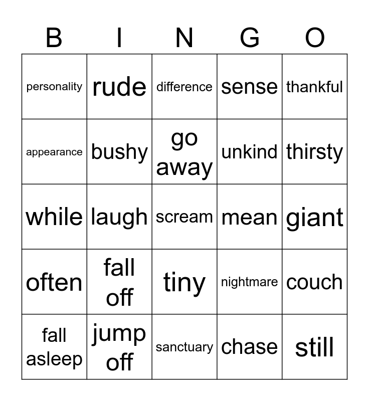 This bingo card has a free space and 24 words: fall off, jump off, go away, fall asleep, thankful, personality, appearance, rude, mean, tiny, unkind, while, nightmare, couch, bushy, chase, giant, difference, thirsty, laugh, still, often, sense and sanctuary.