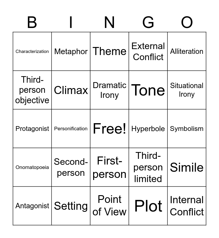 This bingo card has a free space and 32 words: Plot, Allusion, Personification, Oxymoron, Onomatopoeia, Climax, Alliteration, Simile, Metaphor, Repetition, Dramatic Irony, Theme, Foreshadow, Flashback, Hyperbole, Imagery, Antagonist, Protagonist, First-person, Second-person, Third-person limited, Third-person omniscient, Symbolism, Setting, Internal Conflict, External Conflict, Tone, Third-person objective, Characterization, Point of View, Verbal Irony and Situational Irony.