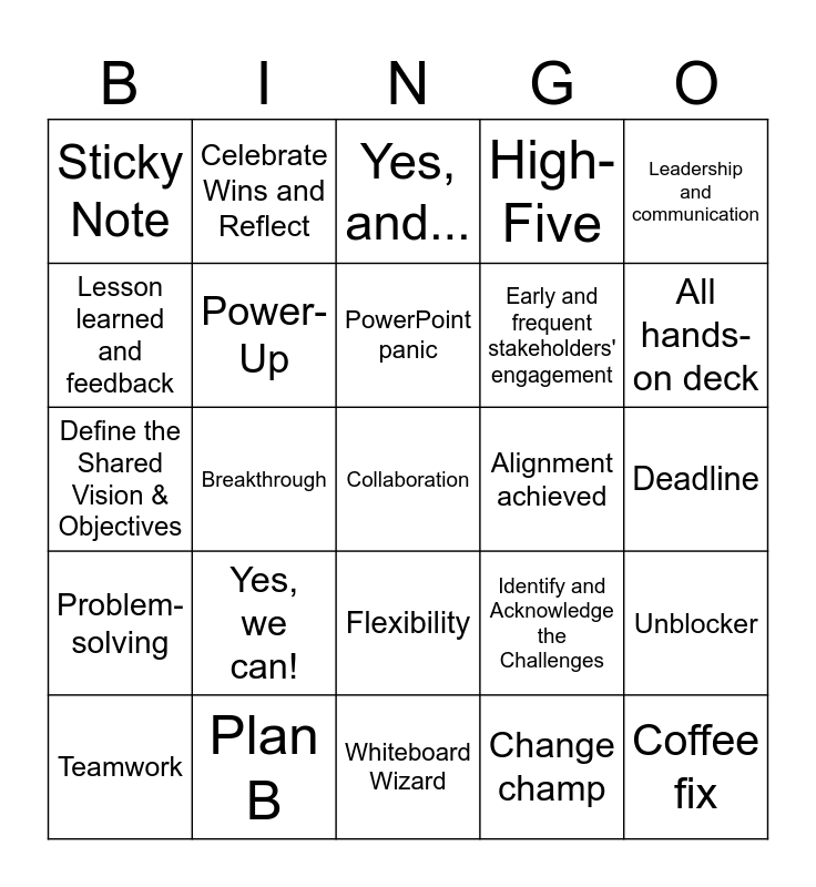 This bingo card has a free space and 29 words: Teamwork, Resilience, Breakthrough, Trust fall, Sticky Note, Yes, and..., Power-Up, Yes, we can!, Alignment achieved, Plan B, Deadline, Coffee fix, Whiteboard Wizard, Change champ, All hands-on deck, Think outside of the box, Flexibility, Problem-solving, Leadership and communication, Define the Shared Vision & Objectives, Identify and Acknowledge the Challenges, RACI, Early and frequent stakeholders' engagement, Lesson learned and feedback, High-Five, Celebrate Wins and Reflect, Unblocker, PowerPoint panic and Scope creep.