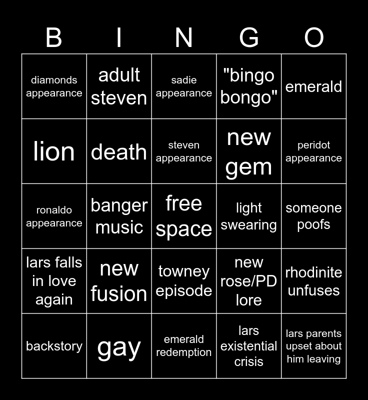 This bingo card has a free space and 24 words: new fusion, gay, steven appearance, backstory, emerald, diamonds appearance, lion, adult steven, light swearing, towney episode, new gem, ronaldo appearance, new rose/PD lore, rhodinite unfuses, death, lars existential crisis, someone poofs, sadie appearance, peridot appearance, banger music, lars parents upset about him leaving, lars falls in love again, "bingo bongo" and emerald redemption.