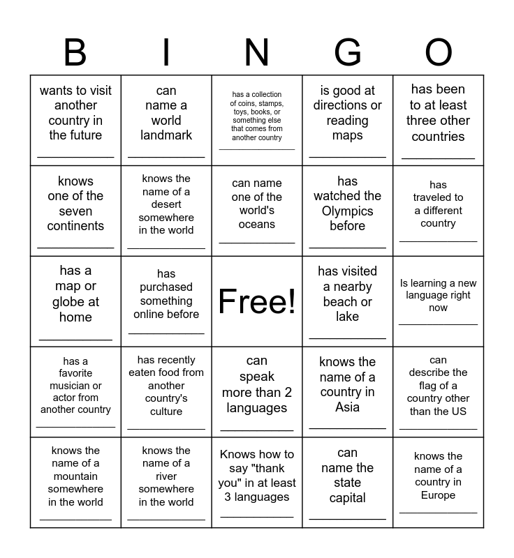 This bingo card has a free space and 24 words: has recently eaten food from another country's culture _____________, knows the name of a river somewhere in the world _____________, can name one of the world's oceans ____________, knows the name of a mountain somewhere in the world ____________, has been to at least three other countries __________, wants to visit another country in the future ___________, knows one of the seven continents ___________, can name a world landmark ___________, has visited a nearby beach or lake ___________, can speak more than 2 languages __________, has watched the Olympics before ___________, has a map or globe at home __________, knows the name of a country in Asia ___________, can describe the flag of a country other than the US _____________, knows the name of a desert somewhere in the world _____________, can name the state capital ___________, Is learning a new language right now ______________, has a collection of coins, stamps, toys, books, or something else that comes from another country ___________________, has traveled to a different country _____________, has purchased something online before ____________, knows the name of a country in Europe _____________, has a favorite musician or actor from another country ______________, is good at directions or reading maps ___________ and Knows how to say "thank you" in at least 3 languages ___________.