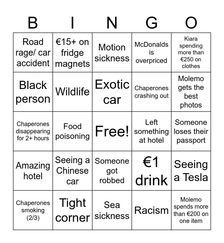 This bingo card has a free space and 24 words: Seeing a Chinese car, Tight corner, Exotic car, Chaperones smoking (2/3), Kiara spending more than €250 on clothes, Road rage/ car accident, Black person, €15+ on fridge magnets, Left something at hotel, Someone got robbed, Chaperones crashing out, Chaperones disappearing for 2+ hours, €1 drink, Seeing a Tesla, Wildlife, Racism, Someone loses their passport, Motion sickness, Molemo gets the best photos, Food poisoning, Molemo spends more than €200 on one item, Amazing hotel, McDonalds is overpriced and Sea sickness.