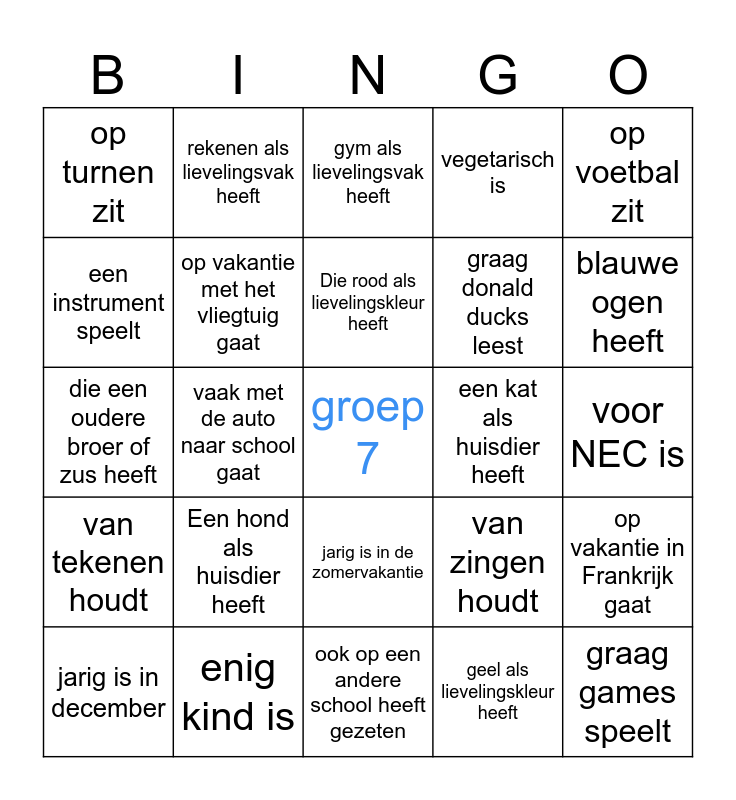 This bingo card has a free space and 24 words: Een hond als huisdier heeft, enig kind is, Die rood als lievelingskleur heeft, jarig is in december, op voetbal zit, op turnen zit, een instrument speelt, rekenen als lievelingsvak heeft, een kat als huisdier heeft, jarig is in de zomervakantie, graag donald ducks leest, die een oudere broer of zus heeft, van zingen houdt, op vakantie in Frankrijk gaat, op vakantie met het vliegtuig gaat, geel als lievelingskleur heeft, voor NEC is, gym als lievelingsvak heeft, blauwe ogen heeft, vaak met de auto naar school gaat, graag games speelt, van tekenen houdt, vegetarisch is and ook op een andere school heeft gezeten.