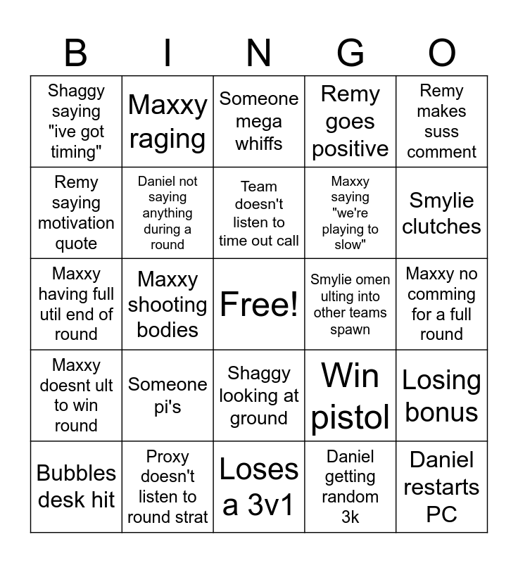 This bingo card has a free space and 24 words: Someone pi's, Proxy doesn't listen to round strat, Team doesn't listen to time out call, Bubbles desk hit, Remy makes suss comment, Shaggy saying "ive got timing", Remy saying motivation quote, Maxxy raging, Smylie omen ulting into other teams spawn, Shaggy looking at ground, Maxxy saying "we're playing to slow", Maxxy having full util end of round, Win pistol, Losing bonus, Daniel not saying anything during a round, Daniel getting random 3k, Maxxy no comming for a full round, Someone mega whiffs, Smylie clutches, Maxxy shooting bodies, Daniel restarts PC, Maxxy doesnt ult to win round, Remy goes positive and Loses a 3v1.